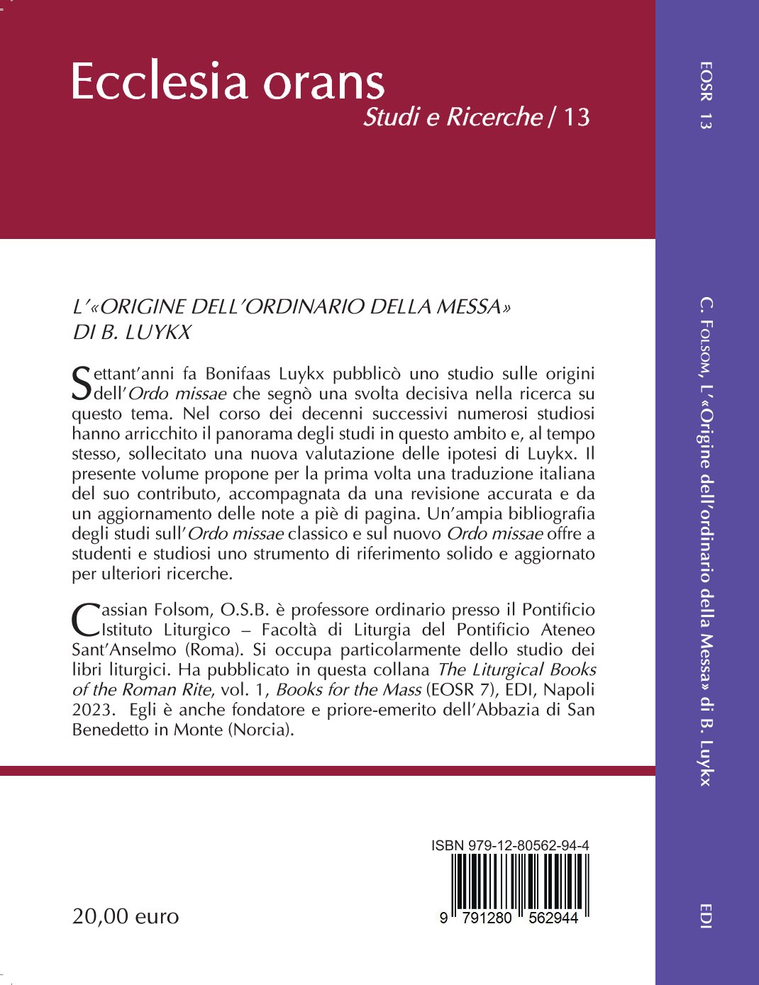 Cassian Folsom, O.S.B., is Full Professor at the Pontifical Liturgical Institute, Faculty of Liturgy of the Pontifical Athenaeum Sant’Anselmo (Rome). His research focuses particularly on the study of liturgical books. In this series he has published The Liturgical Books of the Roman Rite, vol. 1, Books for the Mass (EOSR 7), EDI, Naples 2023. He is also the founder and Prior Emeritus of the Monastery of San Benedetto in Monte (Norcia).