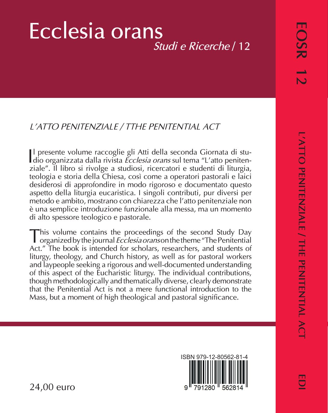 This volume contains the proceedings of the second Study Day organized by the journal Ecclesia orans together with the Pontifical Institute of Liturgy, Faculty of Liturgy of the Pontifical Athenaeum Sant’Anselmo, held in Rome on December 4, 2024, on the theme “The Penitential Act.” The book is intended for scholars, researchers, and students of liturgy, theology, and Church history, as well as for pastoral workers and laypeople seeking a rigorous and well-documented understanding of this aspect of the Eucharistic liturgy. The individual contributions, though methodologically and thematically diverse, clearly demonstrate that the Penitential Act is not a mere functional introduction to the Mass, but a moment of high theological and pastoral significance. Two guest essays by Andrea Grillo and Stefano Parenti expand on the subject, adding significant dimensions.
